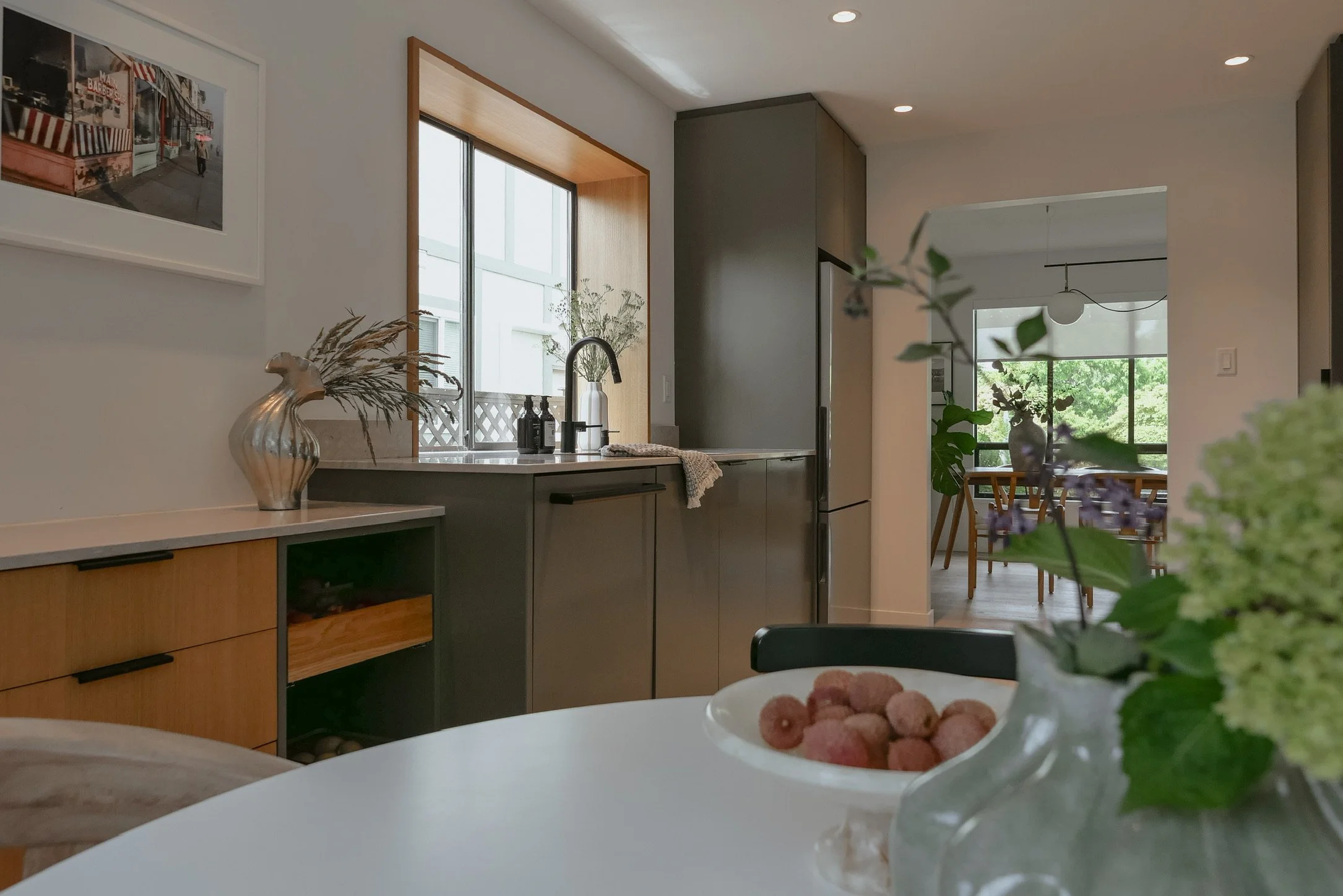 This kitchen was all about bringing in a bit of bold color while keeping things elegant, timeless, and warm. The deep sage green lower cabinets add just the right amount of richness, perfectly balanced by light oak uppers for a fresh, natural look.